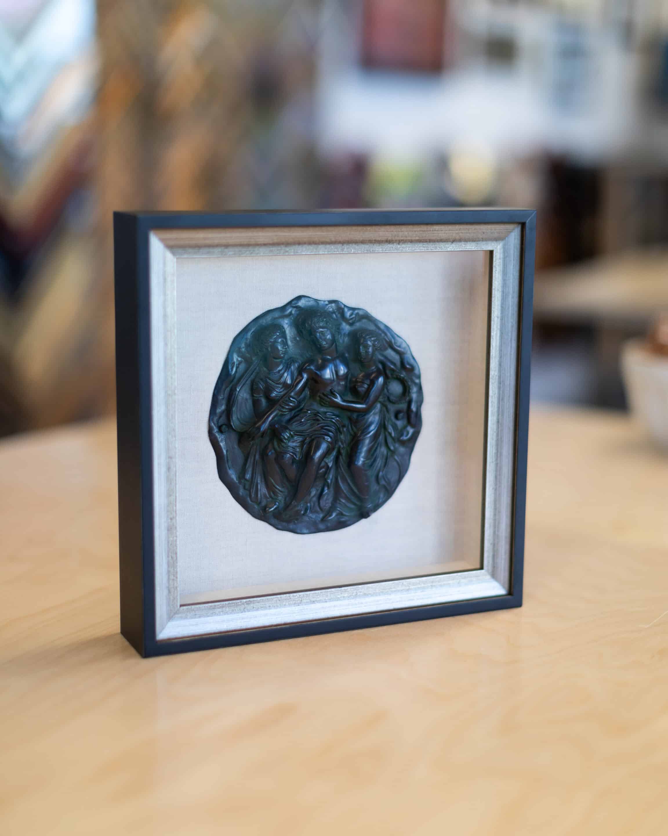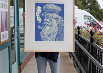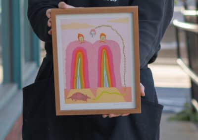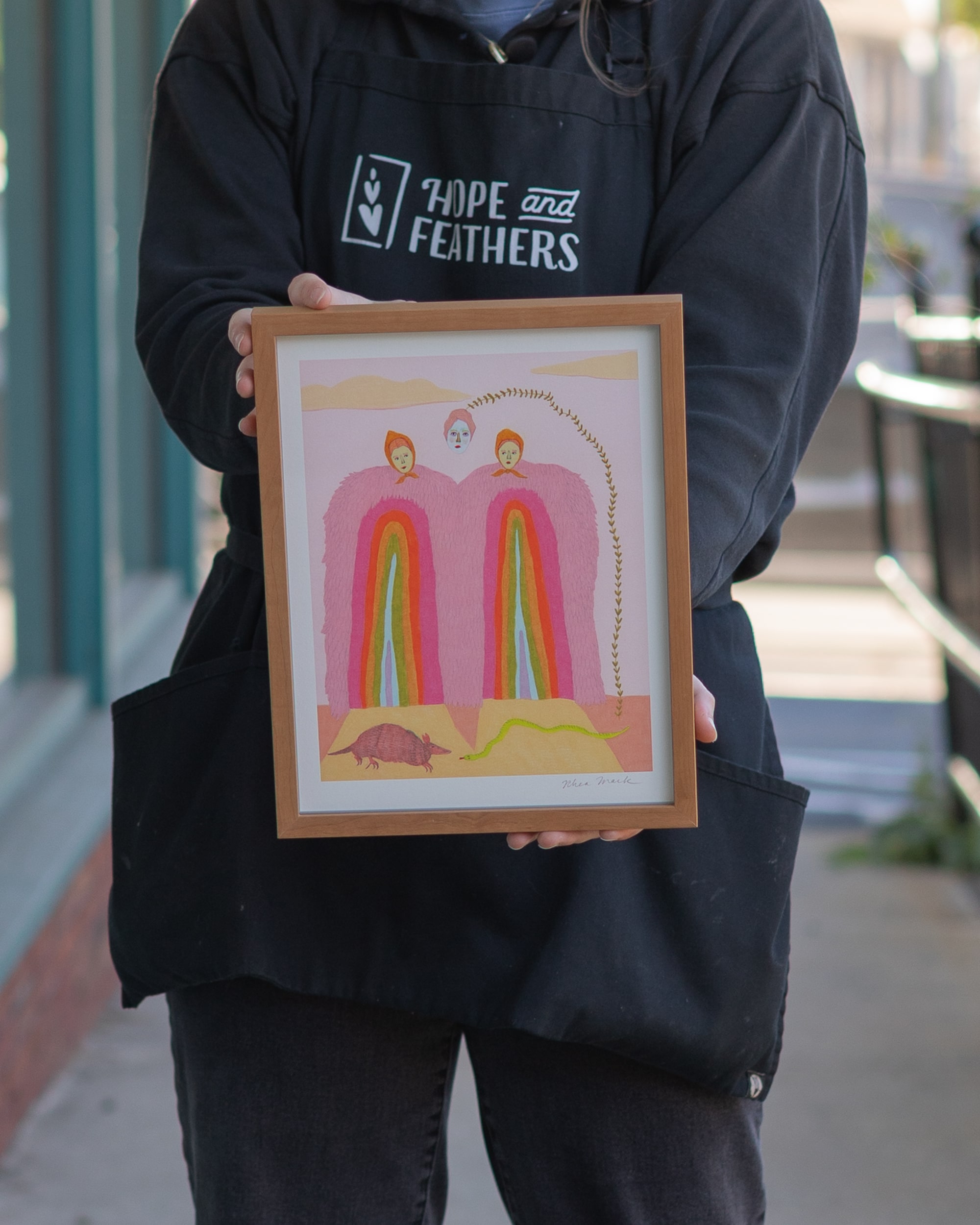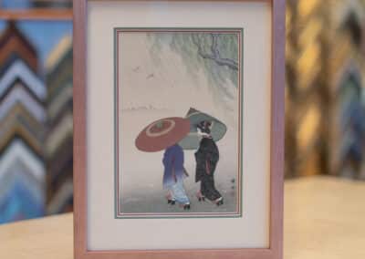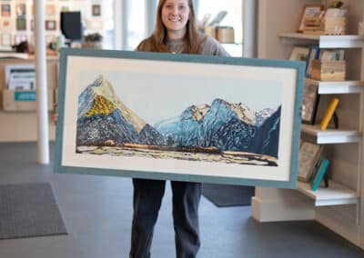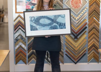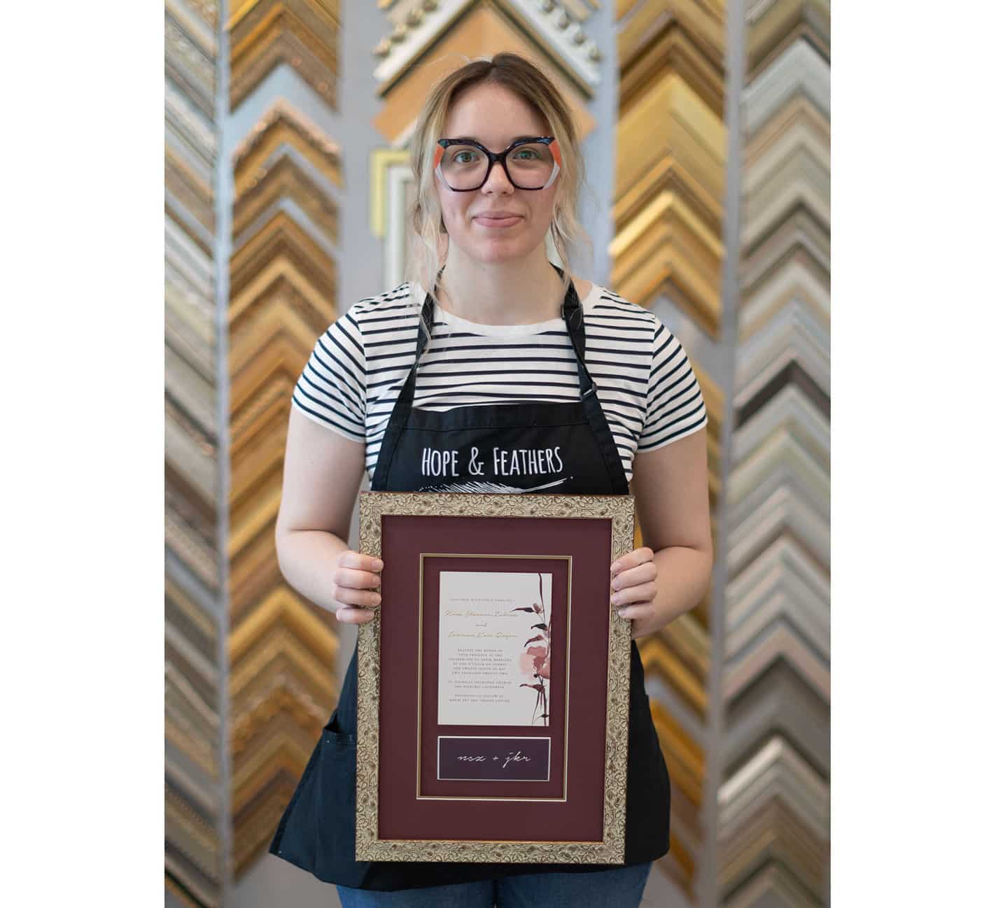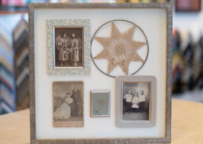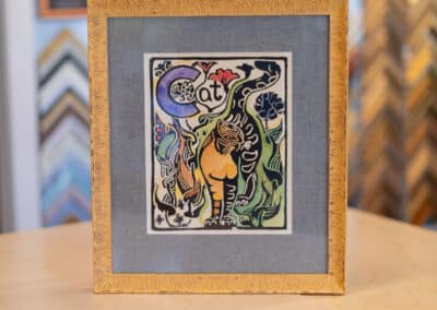 When you bring something into Hope and Feathers to be framed, whether it’s a print, painting, textile, or keepsake, a designer will help you choose materials that complement the piece and fit your style. Every element, from the frame molding to the mat board and glass, is chosen to fit that exact item. The result is something that looks intentional and is made just for you.