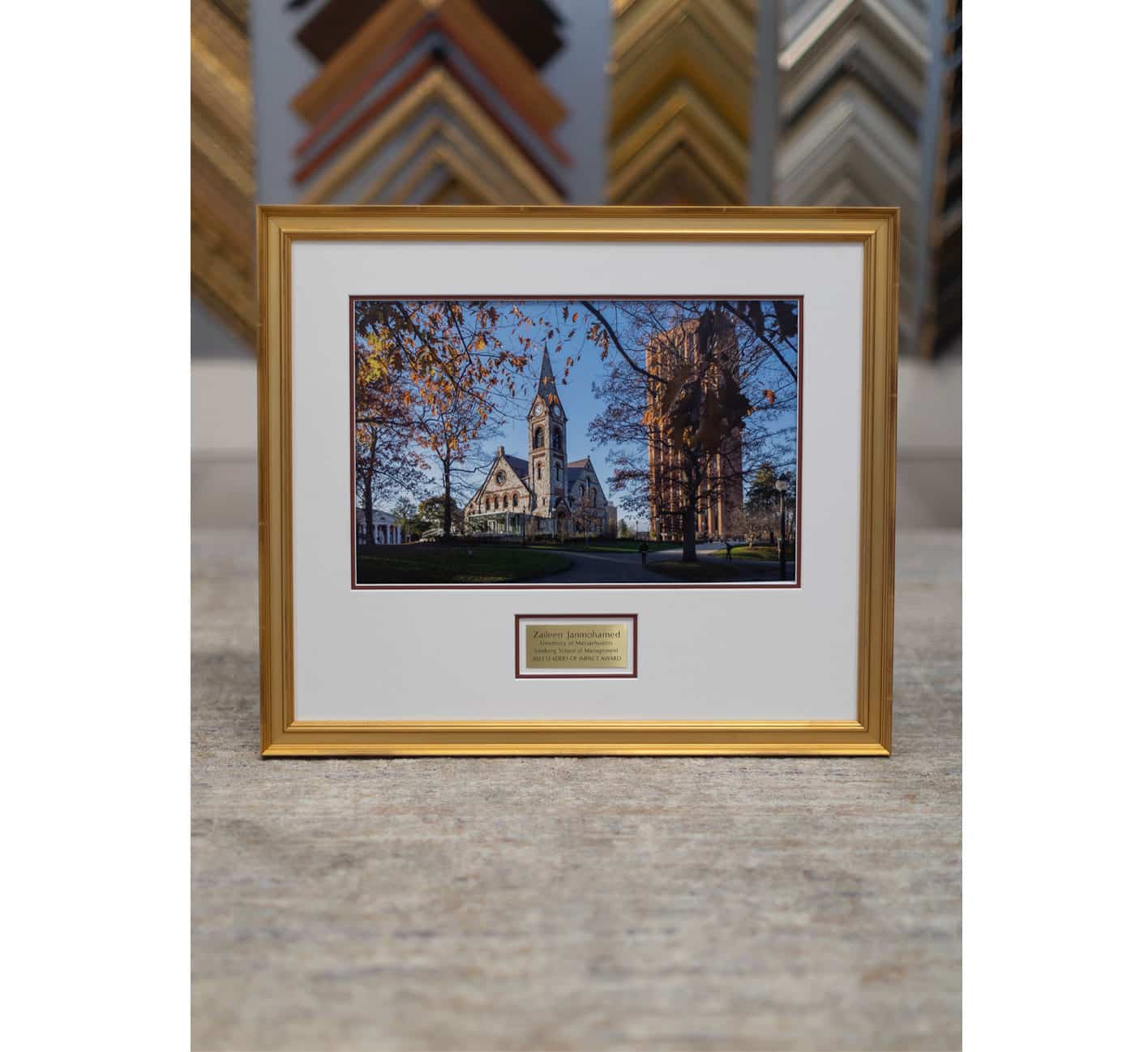 Framing an invitation is a great gift and the perfect way to remember important days. Gold frame, red mat & museum glass.
