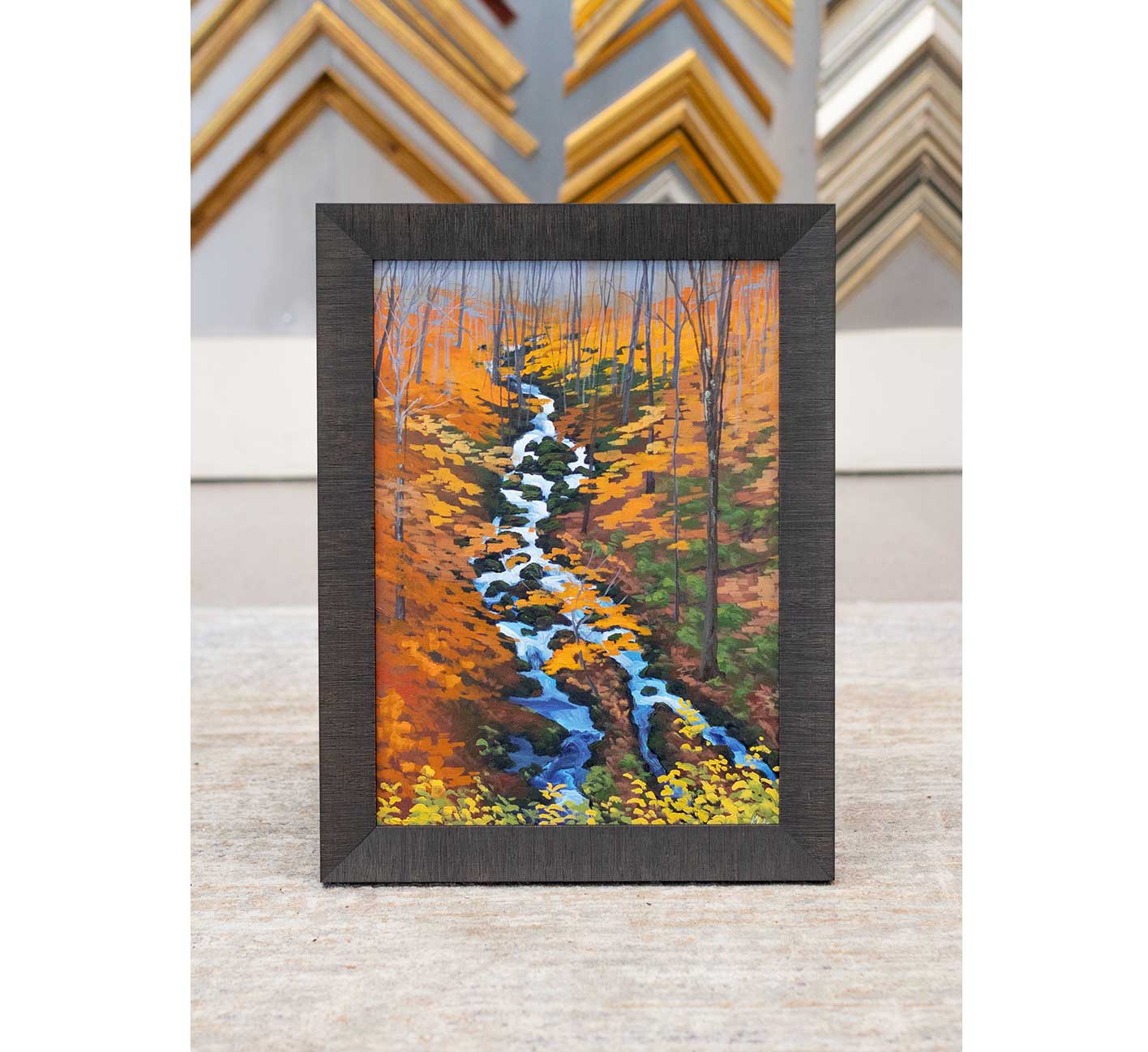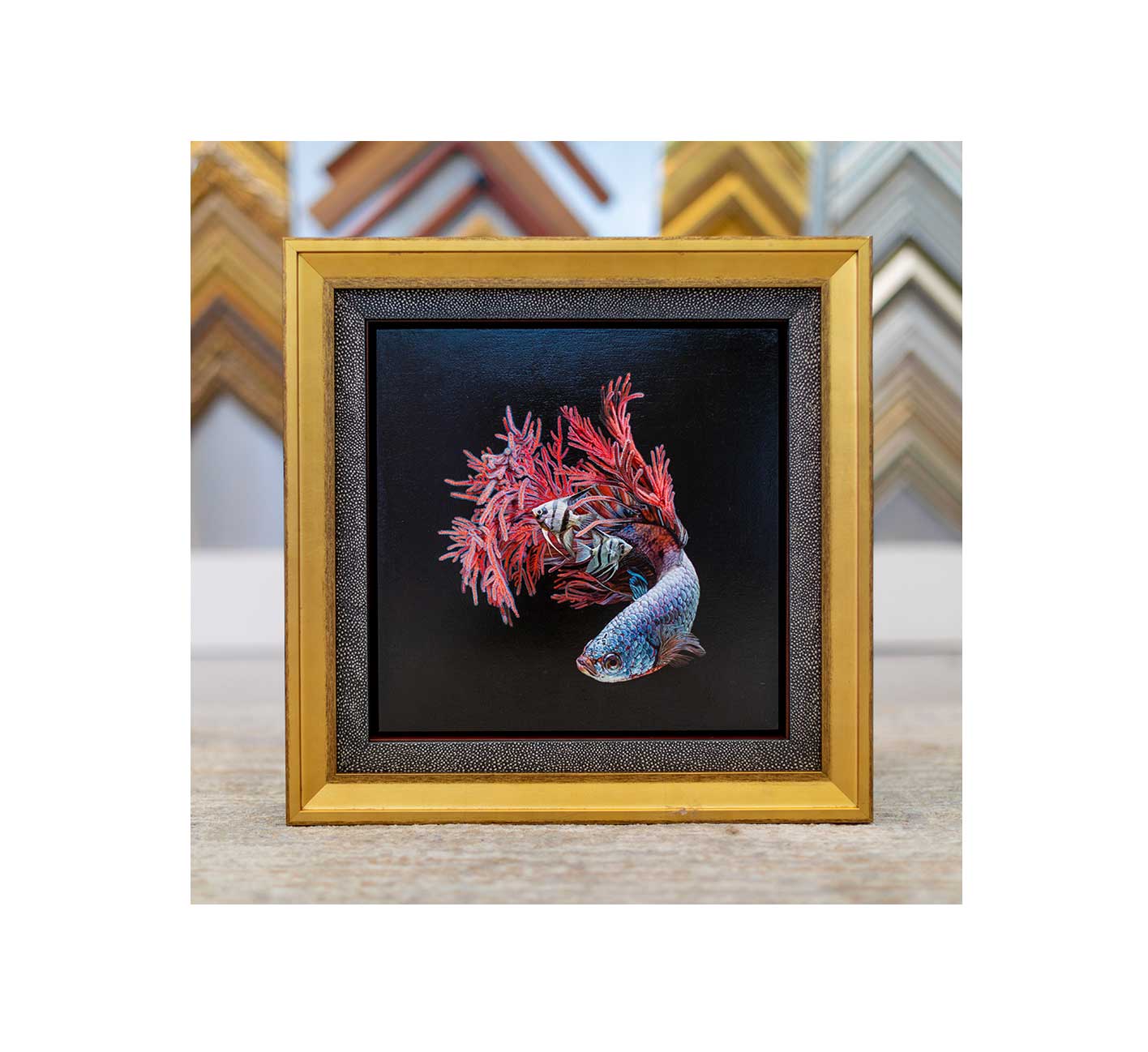 Original oil painting by Lisa Ericson in three unique frames stacked together. A hard wood cherry floating frame, a textured black frame, and a gold frame.